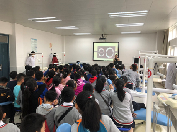 支部党员志愿者带领小记者们参观了头模实验室、临床示教室等口腔实验室并介绍了实验室常用的仪器设备和口腔专业的情况,随后由口腔专业老师根据小学生的年龄特点做了一场《口腔卫生保健》的专题口腔健康知识讲座,并为小记者们解答口腔知识方面的问题。