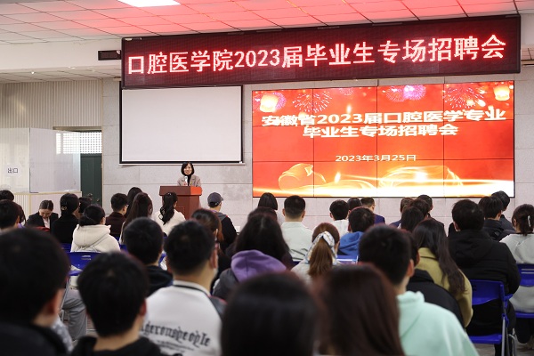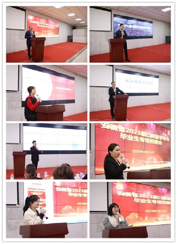 2023届毕业生专场招聘会。邀请到安庆朱小龙口腔医院、淮北博爱口腔医院、蚌埠珍珠口腔医院、渡江口腔医院、庐江协同口腔医院、黄山口腔医院、瑞泰通善口腔医院等11家用人单位参会。会议由欧乐影院