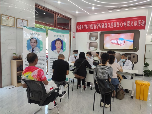 “健康口腔”爱心医疗服务团和珍珠口腔门诊部联合开展了“健康口腔暖民心,志愿服务我先行”专家义诊及暑期“三下乡”社会实践活动,蚌埠医学院第一附属医院徐锦程教授、蚌埠医学院第二附属医院刘茜主任对前来咨询的市民进行认真的口腔检查,学生向市民积极宣传口腔健康基本保健方法,普及口腔健康知识。