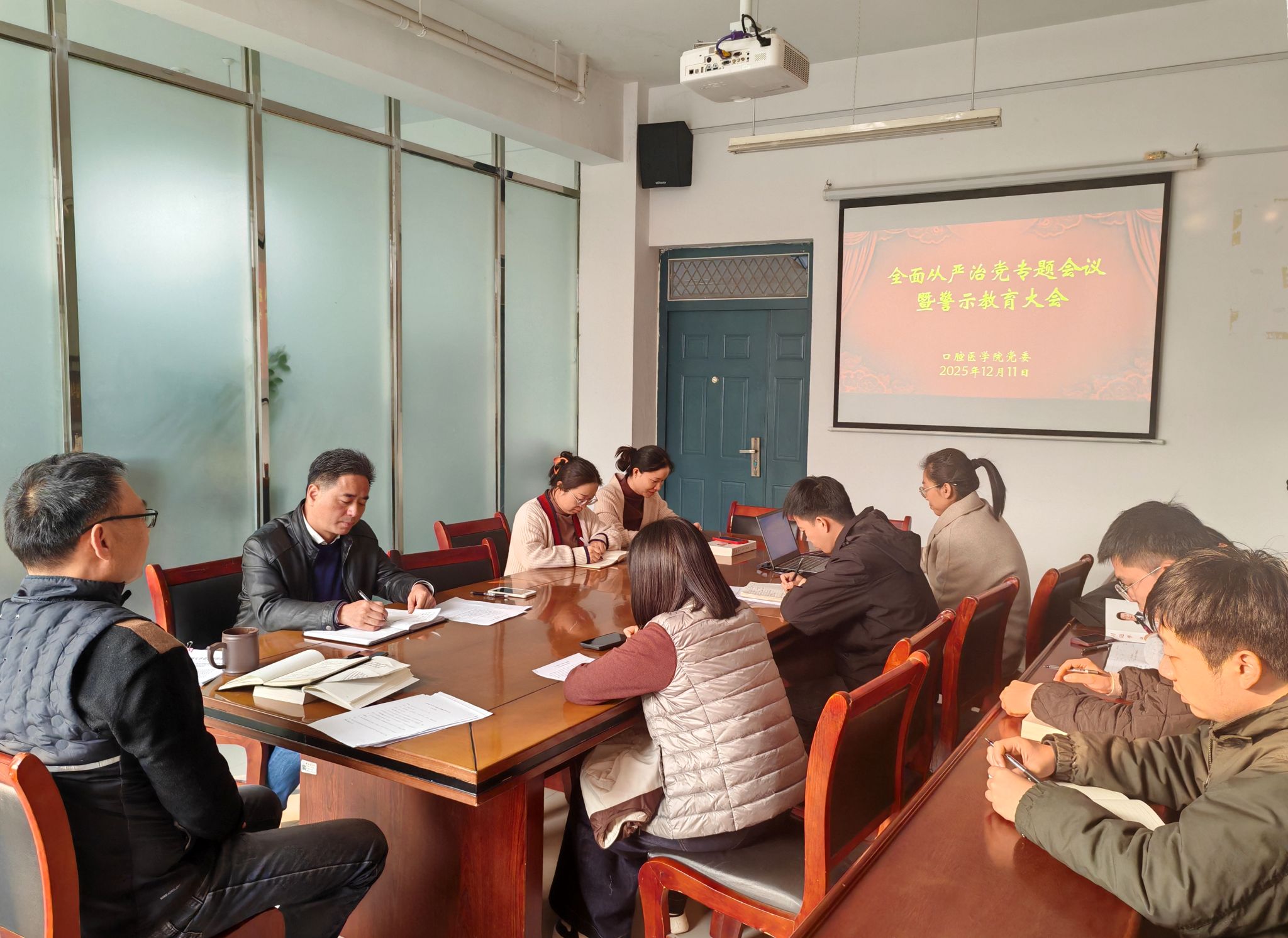 会上,视频学习警示教育片《永远在路上》自我剖析和忏悔;孙文兵书记领学《习近平谈治国理政》第五卷第十八章节中“健全全面从严治党体系,推动新时代党的建设”内容;姜丽娜副院长领学《学习贯彻党的二十届四中全会精神 持之以恒推进全面从严治党》;王少波老师通报《安徽通报8起违反中央八项规定精神问题》;金齐德老师结合学生工作和支部工作实际,就从严治党工作进行主题发言。