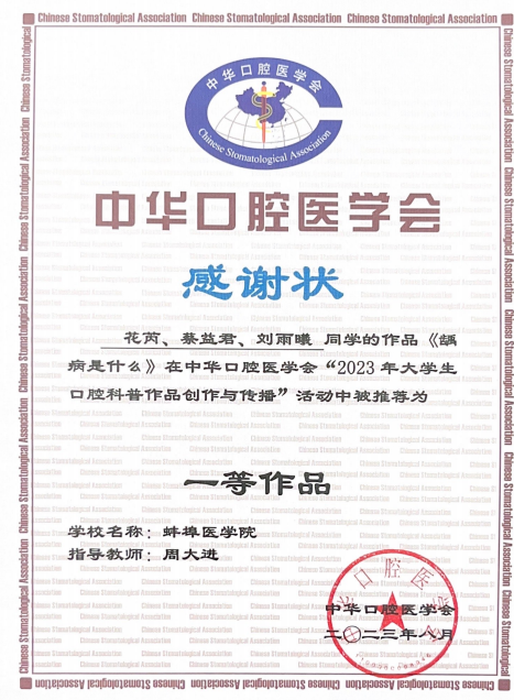 本科生花芮、蔡益君、刘雨曦团队提交的参赛视频作品《龋病是什么》荣获全国一等奖。